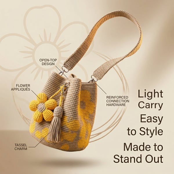 This handmade crocheted floral tote bag is meticulously crafted—stitch by stitch—by experienced artisans. We have selected high-quality pure cotton yarn that is soft yet durable, breathable, and lightweight. The bag’s body is adorned with three-dimensional crocheted flowers, evoking a vintage and romantic charm—as if it were plucked straight from a spring garden.